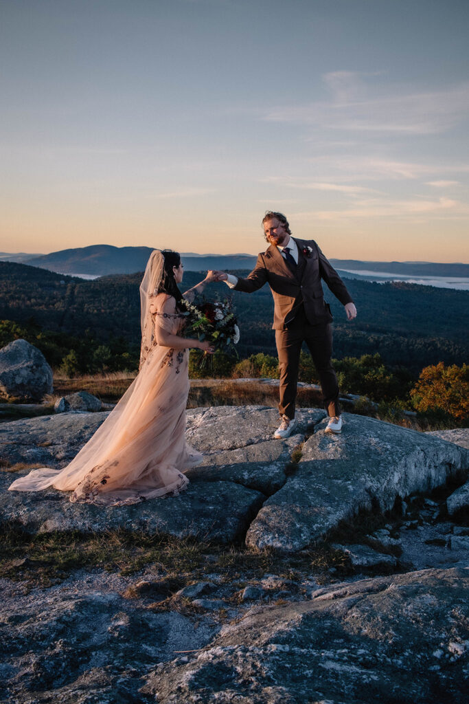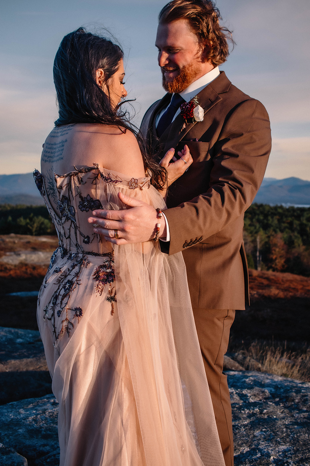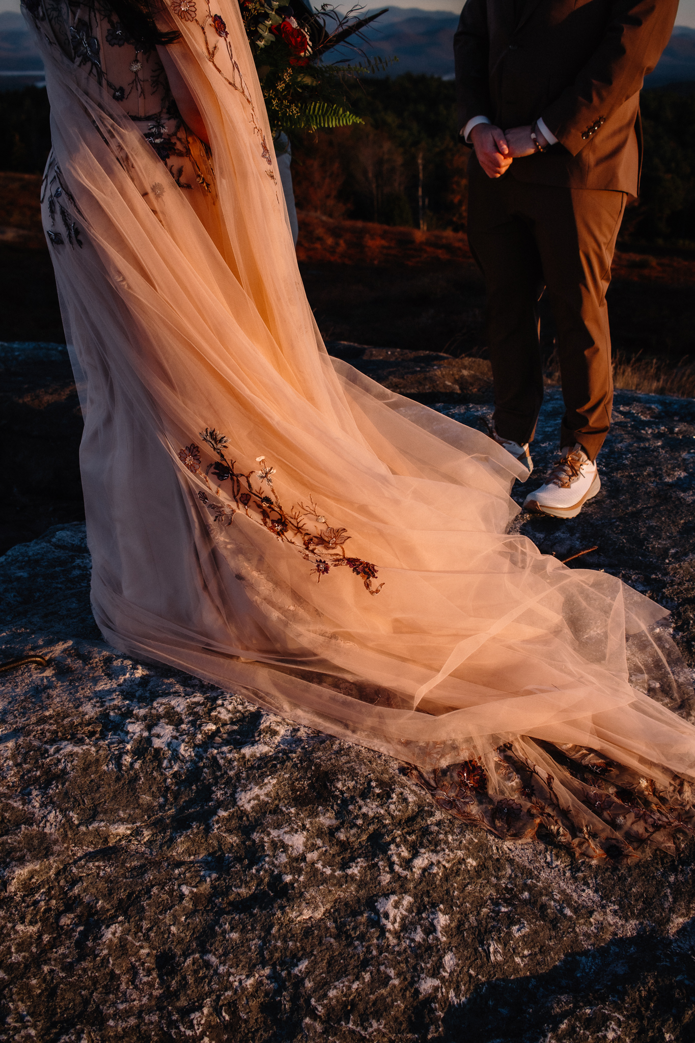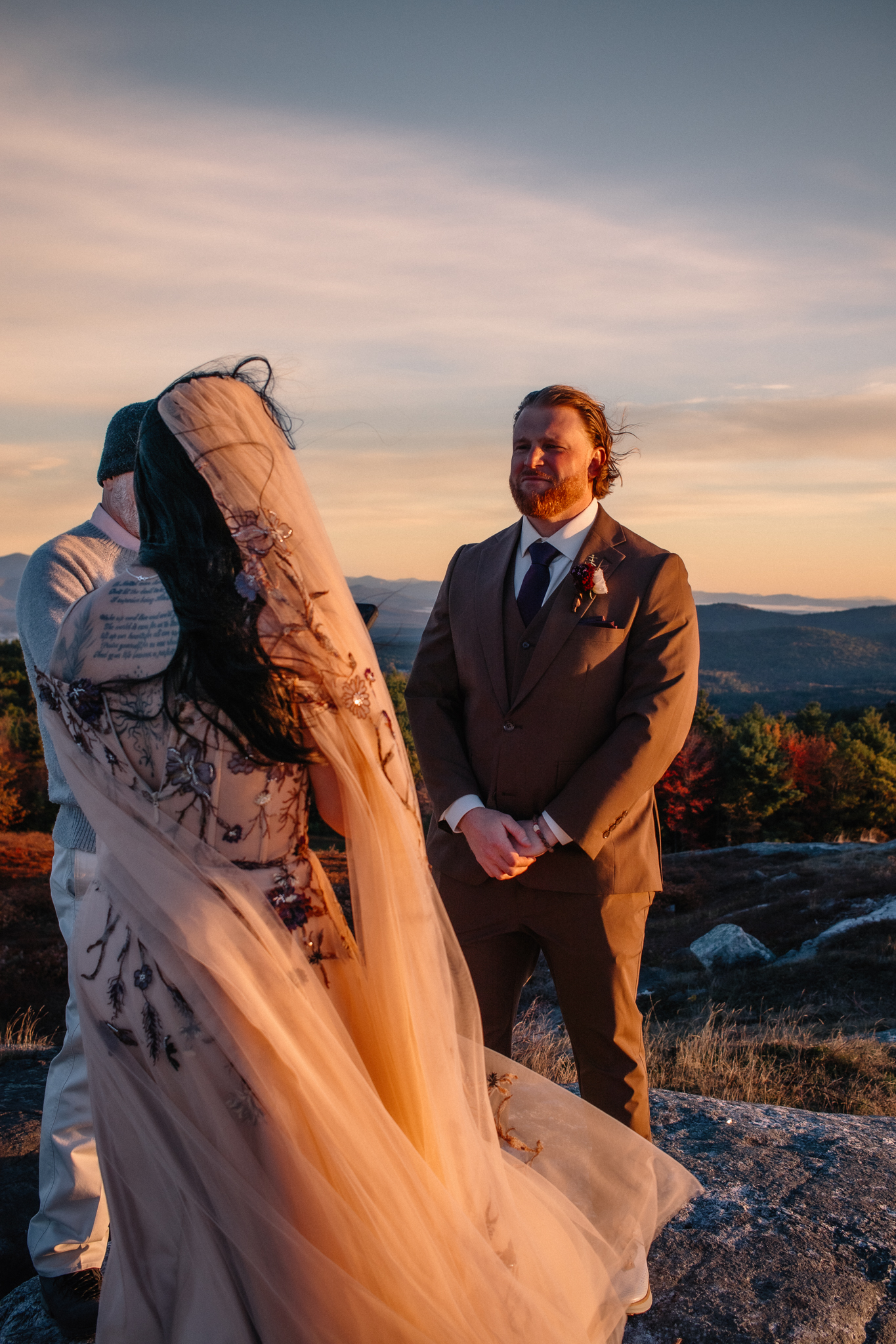 At the top, we were greeted with a clear, unobstructed 360 degree view of the White Mountains and as far south as the Lakes Region, just moments before sunrise. While Ethan and the officiant went ahead to find their mark, Taylor and I stayed back so she could change into her drop dead gorgeous dress and do a few final touch ups.